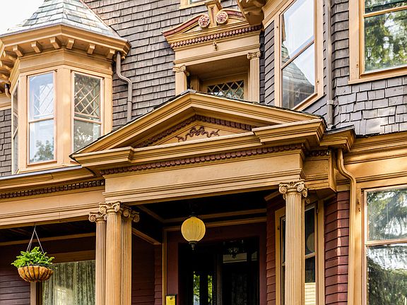Inside, the gracious interior and layout reflects the architectural elegance of a bygone era. Ornamental egg-and-dart moldings, a bifurcated staircase with a vaulted plaster mezzanine, stained glass windows, and ornamental fireplaces speak to the home's craftsmanship and history. The main level includes a parlor, study, and dining room with original tiger oak and parquet floors, and a cheerful kitchen with an industrial Garland stove. Upstairs, four bedrooms and a full bath offer comfort, while a partially finished third floor provides flexible space for a studio, home office, or guest suite. Recent updates have respected the home's heritage while ensuring everyday ease: a new furnace, updated plumbing, refinished porch floors, restored slate roof, and a renovated marble bathroom with a custom viewing window that preserves rare 19th-century wallpaper.