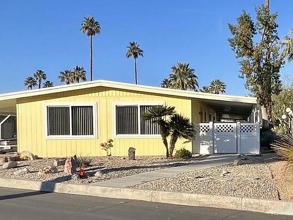 Welcome to your bright and beautifully updated desert retreat in the sought-after 55+ community of El Dorado Palms Estates in South Palm Springs. This move-in ready, fully furnished 2 bedroom, 2 bathroom home sits on a spacious lot with a large private side patio--perfect for relaxing or entertaining. The open layout offers inside laundry, a modern kitchen, and plenty of natural light throughout. Located on the greenbelt with beautiful western and southern mountain views. Recent upgrades include a new roof, new sewer system, tankless hot water heater, whole-house water softener, newer A/C, and all new plumbing. Low monthly HOA dues and you own the land--no space rent. El Dorado Palms Estates is a gated community with amenities including two swimming pools, saunas, tennis courts, a clubhouse, library, billiards room, and more. Conveniently located near Target, Trader Joe's, Starbucks, and popular restaurants.