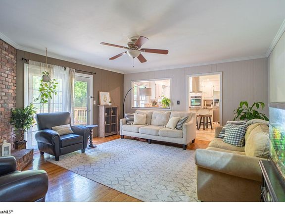 This all-brick ranch on Greenville's highly desirable East side sits on a nearly half acre, fenced in lot and is just 10 minutes from downtown Greenville! The classic 3 bedroom, 2 bathroom floor plan offers both formal and family living areas, an updated kitchen with cabinets galore and an island featuring an induction cooktop and counter height bar seating (renovated in 2018), a dining room, large laundry room with storage closet and attached 2-car garage. Additional updates include new windows in 2014, new HVAC in 2014, new roof in 2017, new gutters in 2021 and a new garbage disposal in 2023. The refrigerator, microwave and wall mounted TV in living room will convey. Step outside to find an expansive deck overlooking the huge, level back yard - perfect for entertaining - and a large, detached storage building with electricity. The rear property line borders Brushy Creek, which creates a flood plain that affects the back yard and the rear left and right corners of the house. Per sellers, neither the home or yard has flooded during their ownership (since 2017) and flood insurance coverage is currently $408/year. The Heritage Hills neighborhood is conveniently located near shopping, restaurants and medical facilities, with easy access to I-385 and zoned for top rated Greenville County schools - Lake Forest Elementary, League Middle, and Wade Hampton High School. Schedule your showing today!