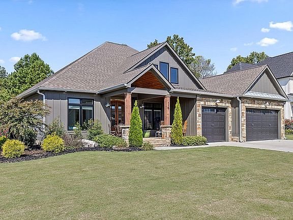 Stone accents, professional landscaping, and a welcoming front porch set the stage for what’s inside. Double wood doors open into a bright foyer with hardwood floors and a sparkling chandelier.