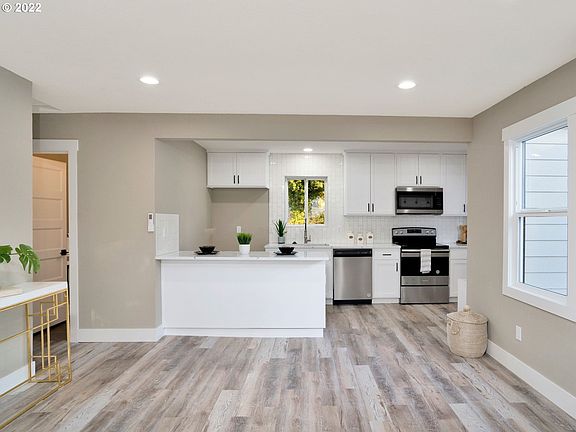 Like New Mid-Century Modern - Remodeled down to the studs. Open layout with great room concept living rm. Remodeled kitchen with eating bar and stainless steel appliances. Luxury vinyl plank flooring throughout. NEW Roof, siding, paint, electrical, plumbing, insulation, vinyl windows and quality craftsman finishes, millwork and fixtures. 1c garage and ample parking. Large fenced yard. Easy living on a quiet street and close to shopping, I-84 & Edgefield