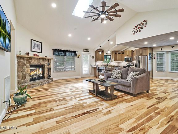 Nestled in a peaceful neighborhood within walking distance to the Lake St George marina, this home boasts a spacious open floor plan with stunning hickory hardwood flooring in the living area, and vaulted ceilings that create an airy and inviting atmosphere. Natural light pours in through a large skylight, highlighting the home's many custom features, including a wood-burning stone fireplace. The kitchen is a true highlight, with custom-made cabinetry, granite countertops, and stainless-steel appliances, including a natural gas stove. The subway tile backsplash complements the modern aesthetic while offering plenty of functional space for cooking and entertaining. The large dining area features a large bay window bringing in additional sunlight. The master bedroom also features a bay window. The split bedroom design has two guest bedrooms and a bath on the other side of the living area. Step outside to enjoy a serene backyard oasis complete with a hot tub on the back deck—perfect for unwinding after a long day. The patio area includes a trellis, ideal for evening relaxation. Recent updates include a one-year-old HVAC system, a two-year-old hot water heater and dehumidifier, and six-year-old roof, offering peace of mind for years to come. The Fairfield Glade community offers 5 golf courses, 11 lakes, tennis and pickle ball courts, swimming pools, parks, concerts and walking trails, to name a few. Buyer and buyer agent to verify pertinent information before submitting offers. Make this home your vacation retreat or permanent residence! Schedule your showing today!