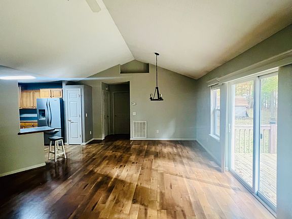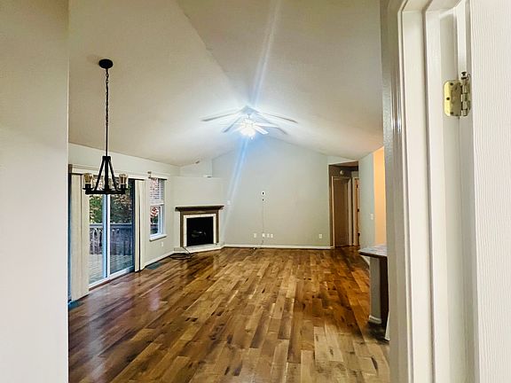 Corner fireplaceStainless steel appliancesOpen planLots of storageCathedral ceilingsTile throughout the homeWood flooring