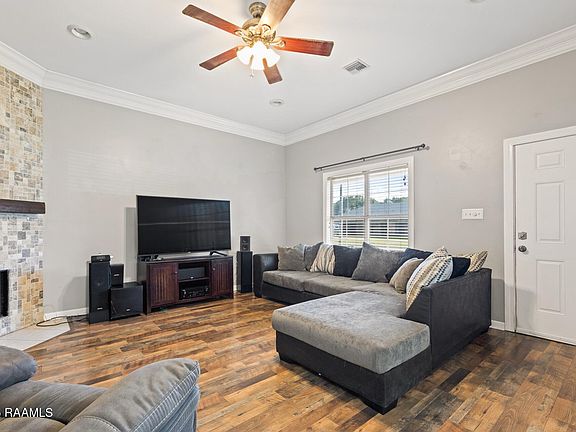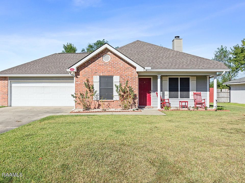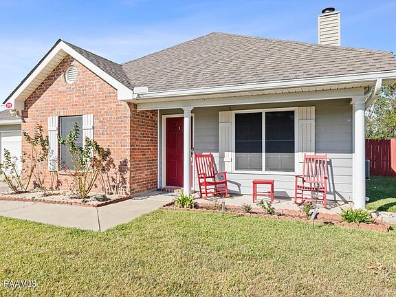 Location, Location! This home is just minutes from Johnston St., offering easy access to all of the amenities Lafayette has to offer. Upon arriving, you're welcomed by the home's notable curb appeal and quaint front porch. Entering the home, you'll walk into the living room complete with wood laminate flooring, a fireplace, crown molding, and a built-in bookcase. Flowing directly from the living space are the dining room and kitchen. The kitchen is equipped with stainless steel appliances (all appliances remain with the home), granite countertops, a tiled backsplash, and ample cabinet storage. The central hallway provides access to the bedrooms and the hall bathroom. The primary suite features a spacious bedroom and a bathroom with double vanities, a whirlpool tub, a separate shower, and a walk-in closet. The backyard is perfect for everyday enjoyment or entertaining with it's oversized covered back patio, a spacious fenced yard, and a storage shed. This home qualifies for 100% financing. Schedule your showing today!