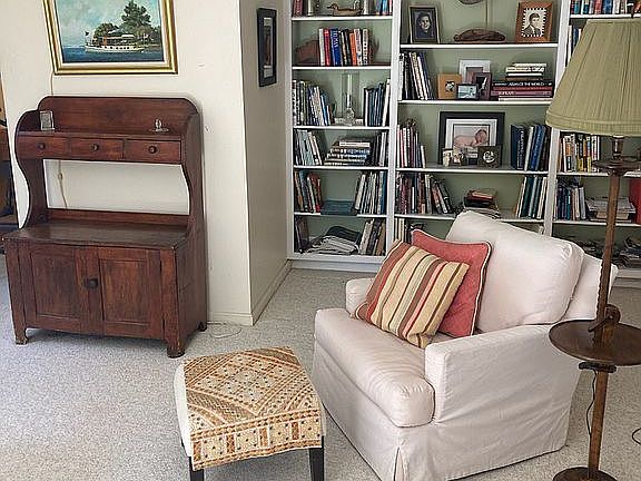 The Gables - Bright, spacious 2 BR, 2.5 bath townhouse with one car attached garage in a charming residential area abutting walk-able fields that are protected from development. This desirable two-story townhouse features an open, southern facing floor plan that includes a large living room bathed in natural light, a wood-burning fireplace, a reading nook with a large built-in bookcase, a spacious kitchen with ample cabinets, and a dining room that opens to an awning covered back deck. Both sizable upstairs bedrooms are graced with attractive windows, built-ins, and large closets. Master bath has a jetted tub, plus separate shower with toilet. Second bedroom also has a full bath. Laundry is located on the first floor.