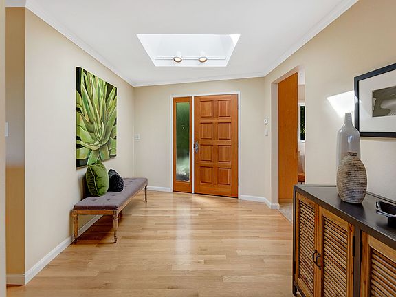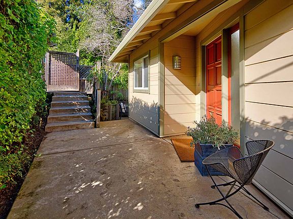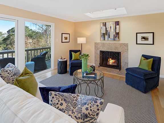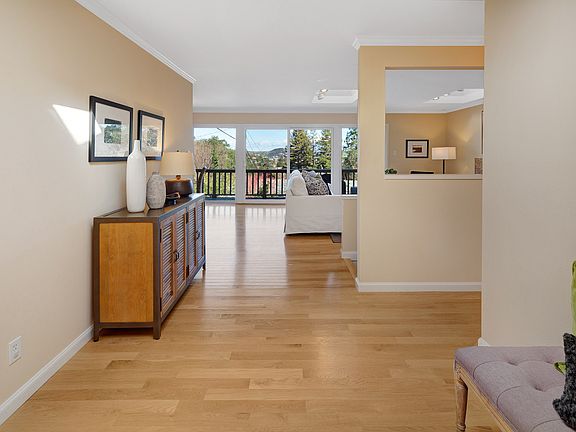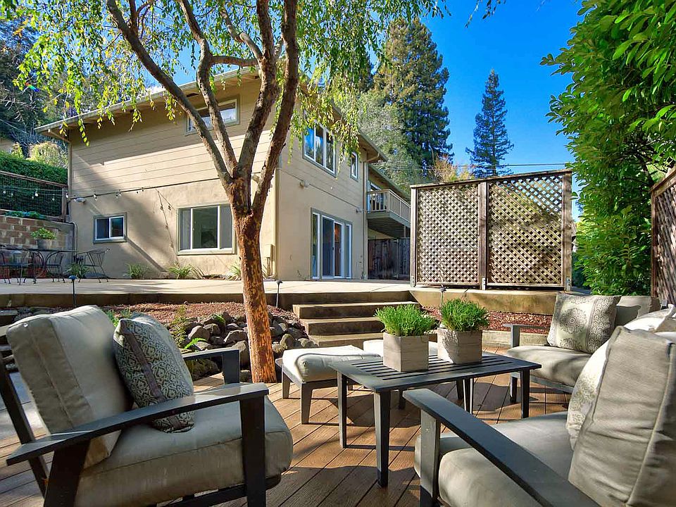 Ideally located at the foot of coveted Christmas Tree Hill, this lovely contemporary home offers privacy, views, outdoor living, walk-to-town convenience and award-winning schools. Featuring an open floor plan, 4 bedrooms, 3 full baths and 2 family rooms, this home is perfect for families or professional couples who work from home or who desire an easy commute to San Francisco. The open-concept living/dining area just off the kitchen features gleaming hardwood floors, bright skylights, a cozy wood burning fireplace and beautiful views. Sliding glass doors open out to a deck that overlooks the valley with partial bay views. The updated kitchen boasts stainless appliances, including a gas cooktop and double ovens, Zodiak quartz counters and ample cabinet space. The kitchen opens out to a side garden ideal for barbecuing and morning coffee. The spacious master suite with large walk-in closet and ensuite bath is located on the main floor along with two additional bedrooms and second full bath. The lower level includes the fourth bedroom and third full bath as well as a second family/media room that flows outdoors. Just outside the second family room is a private outdoor oasis which includes a hot tub, shower and multiple outdoor rooms ideal for entertaining, relaxation and play. Mature landscaping and a variety of greenery add to the secluded feel in the backyard.