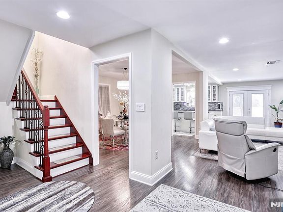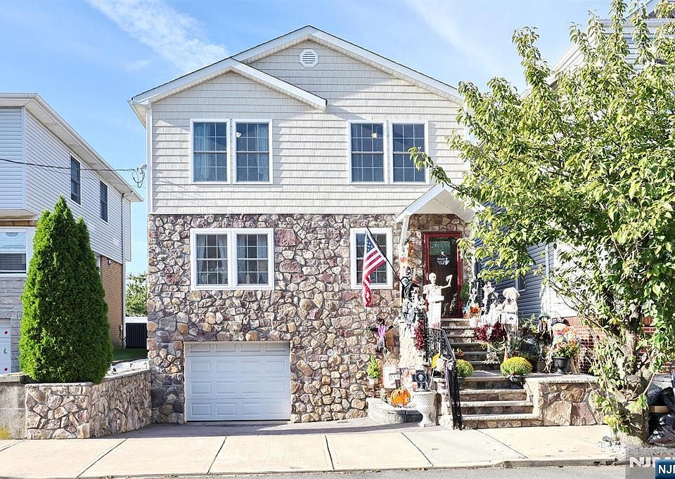 Beautiful 6 year young home built on existing foundation located in North Arlington. Open Floor Plan, spacious home with 5 Bedrooms & 3.1 baths. The first floor welcomes you with an open floor plan. With entry foyer, living room with accent wall, kitchen with central island, formal dining room, bedroom, half bath and door to backyard. The second floor features a large primary bedroom with vaulted lighted ceilings, 2 walk in closets and a large ensuite primary bath with 2 separate sinks & skylight. Second floor also features 3 additional spacious bedrooms, full bath, laundry, multiple linen closets and pull down stairs to attic. Basement is full & finished with an entertainment room, full bath, additional laundry hookups & 1 car garage. Backyard is fully fenced in with jacuzzi tub & sun setter awning. Additional features include: hardwood floors on 1st floor & bamboo flooring on 2nd floor. Plenty of storage, 2 car parking in driveway, 2 zone ac & heating, recessed lighting. Easy commute to NYC with easy access to highways & buses. Close to schools & shopping.