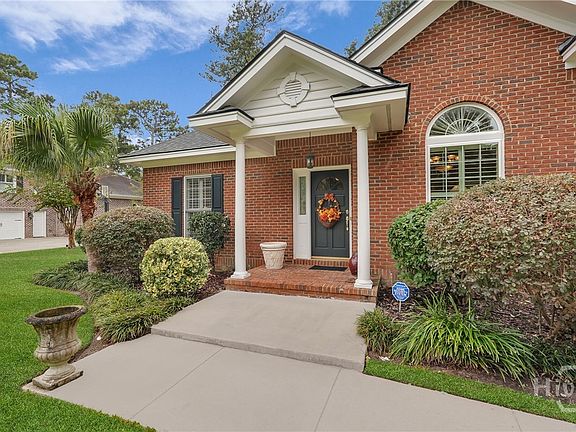 Stately brick home in highly desirable Long Point Community. This immaculate 3 Bedroom, 2.5 Bathroom home sits on nearly half an acre on a beautiful cul-de-sac street. Executive style home with high ceilings, wood plantation shutters, tall windows, hardwood floors, and an excellent split floor plan. Spacious Island kitchen features granite countertops, stainless appliances, an abundance of cabinetry and counter space, and a window flanked breakfast area. The adjacent dining room boasts wainscoting, an impressive arched window and heavy crown molding. Open to the Kitchen is a large family room with fireplace, soaring ceilings, built in bookcases and French doors leading to the covered patio and screened porch. Sizable primary bedroom has a walk-in closet and full en-suite bathroom with soaking tub, separate shower and double vanity. Fantastic yard with fruit trees, garden area, lush landscaping, quaint walkways, fenced area, and wooded buffer along side and back. Nature enthusiasts will appreciate watching deer from the screened porch. Neighborhood amenities include a community dock, manned guard gate, pool with marsh and river views, playground and tennis courts. Ideal location with many shopping and dining options, just minutes from Historic Downtown Savannah.