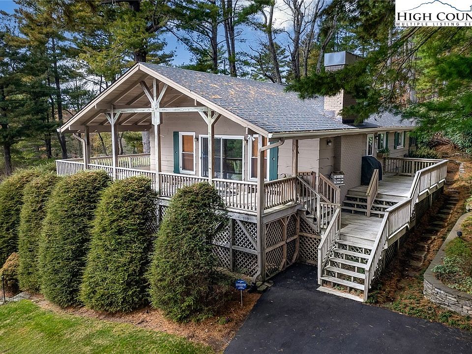 Experience the charm and character of classic Blowing Rock living in this quintessential mountain cottage, perfectly positioned with stunning views of Grandfather Mountain and Blackberry Gorge. Just minutes from Blowing Rock Country Club—with convenient golf cart access—this feather board cottage combines timeless appeal with thoughtful updates. The vaulted great room welcomes you with a wall of windows and sliders that frame the dramatic gorge views, while tongue-and-groove ceilings with exposed beams and a cozy propane fireplace create a warm, inviting atmosphere. Beautiful hardwood floors flow throughout the home, complemented by ceramic tile in the baths. Offering three bedrooms with en-suite baths, this home provides comfortable accommodations for family and guests alike. The primary suite, a graceful addition completed in 2002, serves as a serene private retreat. While the cottage maintains a modest footprint, it lives large with an impressive 1,626 square feet of covered and open decking—perfect for relaxing, entertaining, or simply taking in the mountain air. The lower level beneath the original structure includes a partial walk-in basement, professionally sealed with CleanSpace and featuring a dehumidifier installed by Tarheel Basement Systems. This area also includes built-in shelving and double cedar closets.  Originally built with craftsmanship and later enhanced with care, this home has been meticulously maintained and looks as fresh today as it did two decades ago—a true Blowing Rock treasure offering both comfort and character in one of the High Country’s most sought-after locations.