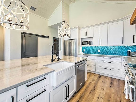 This thoughtfully designed home features an open-concept layout with soaring vaulted beam ceilings, a split-bedroom floor plan, and expansive windows that invite natural light throughout. The waterside primary suite is a true retreat, complete with a spa-like bath offering a soaking tub, separate shower, dual vanities, and an oversized master closet.