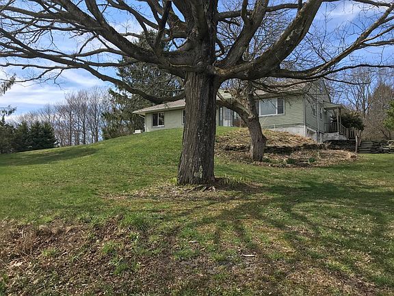 This sunny ranch with sweeping views has everything you want in a country home or a weekend getaway. Updated baths, wide open floor plan, plenty of land to roam. Galley kitchen with plenty of cabinets overlooks the backyard with an old apple tree and swing set. The dining area and living room are all about light and the outdoors, and double picture windows make the most of the meadow view and distant hills beyond. A cheery sun room and deck to one side bring natures indoors. The elegant Morso wood stove keeps it cozy, plus there's a hotplate for simmering soup or stew. Three bedrooms toward the back, and additional family room with Hearthstone gas stove downstairs, a half bath, as well as a workshop, laundry room with gorgeous vintage kitchen sink. An additional bonus space is insulated but unfinished, and the full attic also offers expansion options. Newer roof, septic, one car garage below, garden shed in backyard. Country quiet with one neighbor. Two adjoining lots separated by tall pines. This spacious, comfortable home on the hill will be a happy home for many years to come.