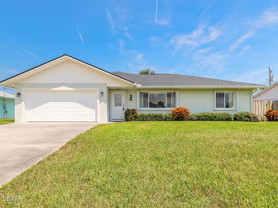Discover the charm of this well-maintained concrete block beach home, offering 3 comfortable bedrooms and 2 bathrooms. Step inside to an open and airy family room, where vaulted ceilings create a sense of spaciousness and welcoming light fills the space. The kitchen stands out with its crisp white cabinetry, abundant recessed lighting, and stainless steel appliances. A breakfast bar and adjacent dining area make it easy to enjoy morning coffee or family meals, with large windows inviting in plenty of natural sunlight. The dedicated laundry room includes a handy closet for extra storage, keeping chores organized and convenient. Recent updates, including a new roof in 2022 and HVAC system installed in 2018, provide peace of mind for years to come. The main bedroom serves as a quiet retreat, featuring a walk-in closet and an ensuite bath complete with a walk-in shower and direct access to the Florida room. Guests will appreciate the privacy of the split floor plan, with spacious secondary bedrooms and a guest bathroom that features a tub and shower combination under a bright skylight. Unwind year-round in the glass-enclosed Florida room, designed for relaxing or entertaining regardless of the weather. Hurricane shutters offer added security and reassurance during stormy seasons. Throughout the home, tile and vinyl flooring are both stylish and easy to care for, making everyday living a breeze. A 2-car garage with remote entry makes coming home effortless, while the fully fenced backyard provides a safe haven for children or pets to play. The automated irrigation system keeps the beautifully landscaped grounds lush and inviting all year long. Experience a home where every detail is designed for comfort, relaxation, and the joyful rhythm of beachside living. Septic tank and drain field located in front making room for pool in back yard.