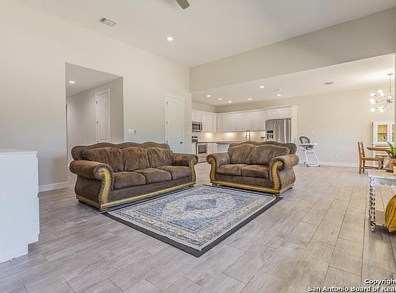 This beautiful 2021 home is gently lived in and sits on a corner lot that is over 1 acre. Upon entry the two secondary bedrooms and bath are off to the left. The Kitchen, dining and living room are open to each other. The high ceiling in the living room and wall of windows add to the spacious feel. Granite tops, stainless appliances and island with breakfast bar in the kitchen. The master bedroom has a huge closet and bath with a garden tub, separate shower and double vanities. The approx. 19'x6' covered back porch has a ceiling fan. The yard has lots of trees and a Texas Hill Country feel.