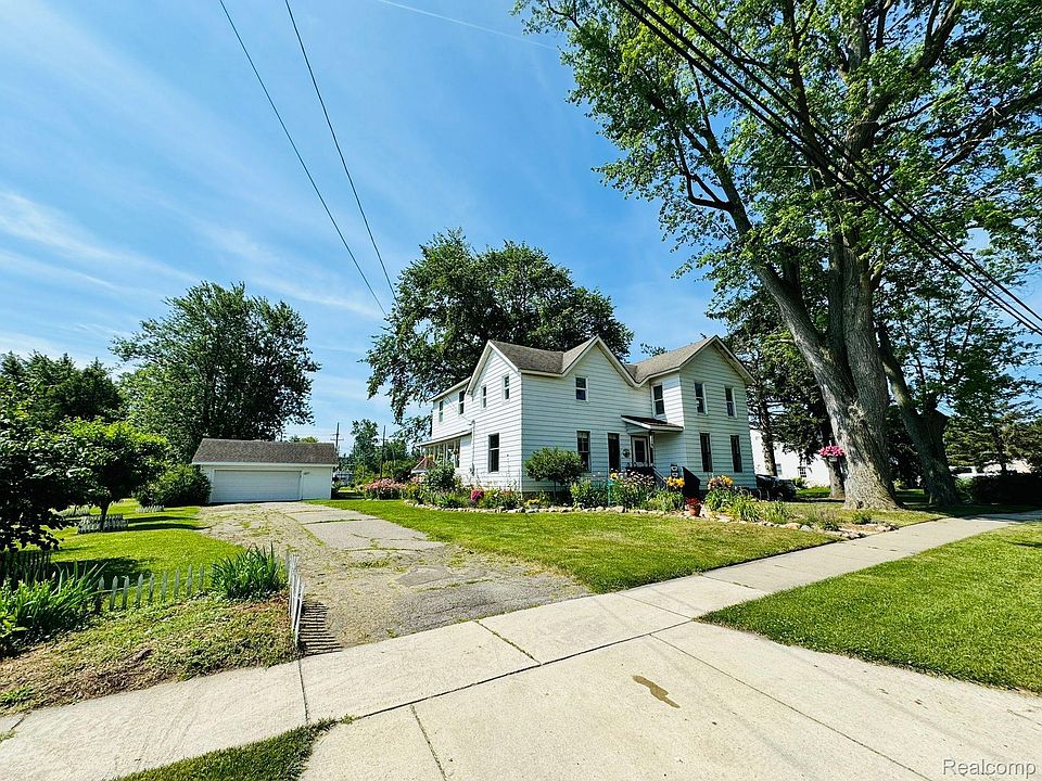 You are greeted by stunning landscaping that has been selected for the Milan Annual Garden Tour this year on July 20th!! Gorgeous covered wrap-around porch invites you to relax and enjoy the peaceful surroundings, perfect for savoring your morning coffee or unwinding in the evening. This home has historical significance in Milan with original hand carved woodworking & Extra tall 9' ceilings on the entry floor. Could easily be a 2 unit home for an investor or a single family home for a family. Separate Staircase entrance for second floor, both floors have full kitchen, full bath, & living room. 1st Floor living room boasts hardwood floors and offers ample natural light, creating an inviting atmosphere for gatherings or quiet relaxation. Full Bath with jetted tub & First Floor Laundry. 1st Floor Bedroom would also be a great place for an office or playroom. Newly Renovated 1st Floor Eat-In Farm Kitchen has is perfect for family meals and gatherings. Second Floor offers living room, kitchen, dining room, Remodeled Full Bath with rainfall showerhead, and 3 bedrooms. All appliances in both kitchens and washer/dryer are included with the sale. Large Lot and 2.5 car detached garage with additional storage shed