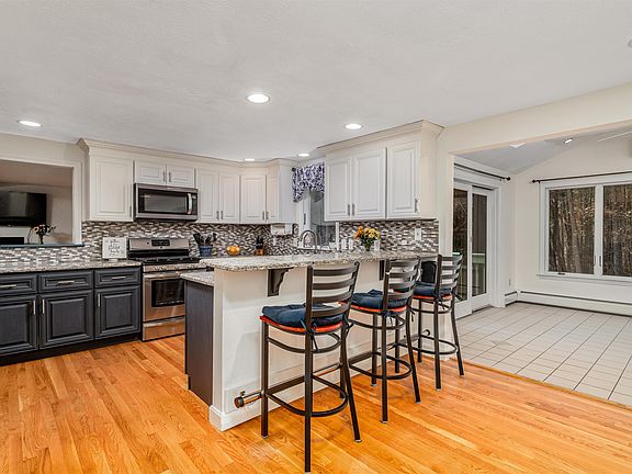 This lovely country residence located in desirable south Hollis has been meticulously cared for and updated to create your move-in ready new home. Beautiful hardwood floors inspire warmth throughout. The heart of the home chef’s kitchen boasts gas range, stainless appliances, custom color cabinetry, rich granite, pantry and more. Just off the kitchen is the cozy dining area and open family room where you will appreciate the warmth of the masonry fireplace with gas insert – a perfect place to relax or entertain. Large living room features wall of custom cabinets with granite counters - perfect for your home office or even a playroom or study. Overlooking the backyard the skylit sunroom presents captivating nature views and conservation land, hiking trails beyond. Nice ¾ bath and oversized storage closet complete this floor. Ascend the charming staircase to the 2nd floor where you’ll find 3 spacious bedrooms, lovely full bath, laundry, and walkup attic. The 4th bedroom primary suite features gorgeous granite top vanity with double sinks, tile shower & jetted tub. Lower level has workshop space with cabinets, plentiful storage, a daylight/walkout bonus room for projects or play. Two storage sheds, perennial gardens and lush lawn outside offers plenty of room to play. Buderus boiler, central AC, Gen-Line, and so much more. Experience the beauty of country living while still enjoying easy access to major routes, restaurants and retail nearby. Welcome home to this Hollis gem!