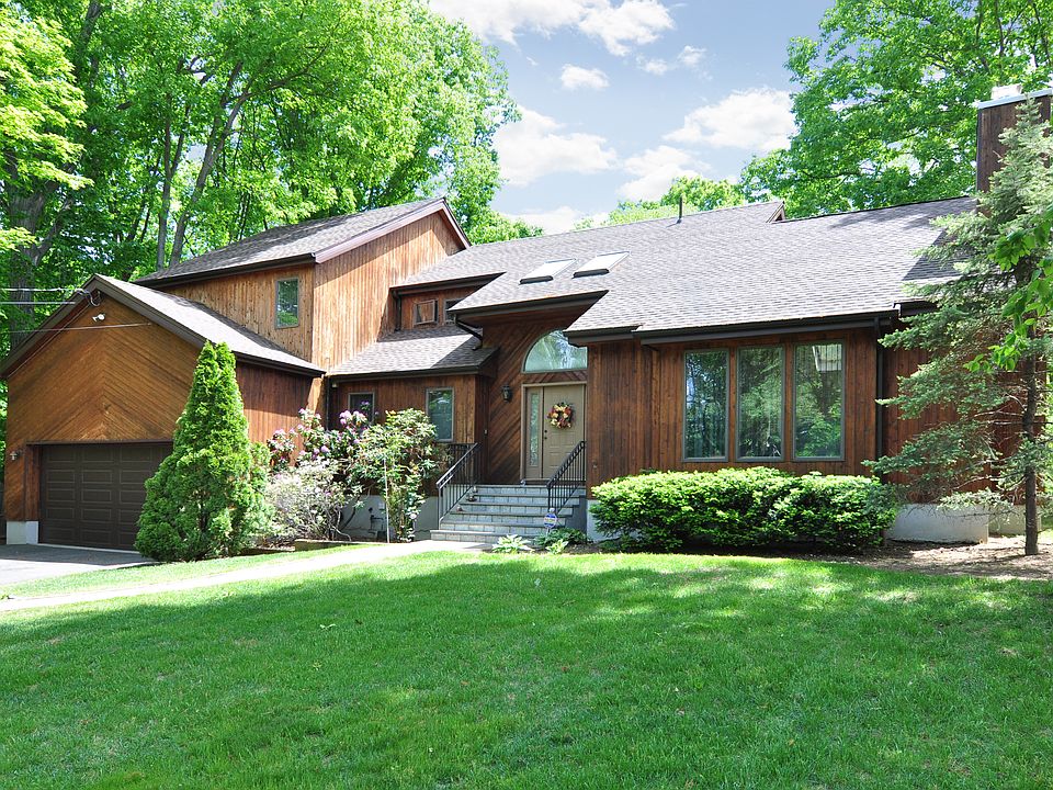 Custom built four bedroom, spacious and light-filled contemporary located on private cul-de-sac features a two story entry foyer, formal dining/living room with fireplace, vaulted ceiling, hardwood floors and walls of windows. The inviting Eat in Kitchen complete with hardwood floors, tiled counter tops and Center Island leads out to large deck for summer entertaining overlooking beautiful half acre. A large family room with Fireplace and Glass doors to the deck is directly off the kitchen. The first floor bedroom (which can also be used as an office/den), a separate laundry room, half bath, and door to two car garage complete the first floor. The second level boasts a spacious en-suite master bedroom with large walk in closet, two more bedrooms and half bath. New roof and deck. Parking at Hartsdale train station. Located in the Chauncey Estates area of Ardsley, this is a home you can make your own!