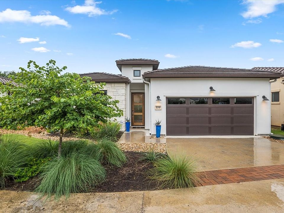 This stunning single-story home offers a spacious and elegant design, perfect for comfortable living and entertaining. The residence features a private study, a great room with soaring 15-foot ceilings, beautiful wood floors, modern fixtures, and a striking floor-to-ceiling stone fireplace. The chef’s kitchen is a true highlight, boasting a luxurious island with custom cabinets, a pantry, granite countertops, and a full suite of high-end Bosch stainless appliances, including a gas cooktop. The primary suite serves as a private sanctuary, complete with a relaxing sitting area, dual vanity with granite countertops, a large walk-in closet which include additional custom shelving, and a beautifully tiled frameless glass shower. The guest suite offers privacy, with an en suite bath featuring granite counters and a tiled shower tub combo. A convenient half bathroom is ideal for daytime guests. Exterior features include a 2-car garage, tile roof, covered rear patio, automated sunshade, covered side patio just off the kitchen adding the perfect amount of area for entertaining your dinner guests or a enjoy a personal Friday night cook out. All located on a beautifully landscaped private backyard with scenic views of the Texas Hill Country, perfect for star-gazing nights. Enjoy resort-style living with endless amenities in this vibrant community. From pickleball tournaments, wine tastings, and arts & crafts to the community garden, dog park, and a gorgeous new 5,000 sq ft clubhouse—there’s always something to enjoy. Don’t miss the famous Wednesday Pink Flamingo nights! Whether you're seeking a full-time residence or a lock-and-leave retreat, this home in Tuscan Village offers the perfect balance of leisure and luxury in a vibrant 55+ community. Live well, Live beautifully, and find your well-being in an atmosphere of connectivity and enjoyment. Ask your Real Estate professional about the Social Membership to HSB that the seller is willing to provide to the buyer.