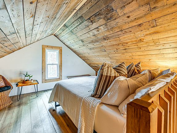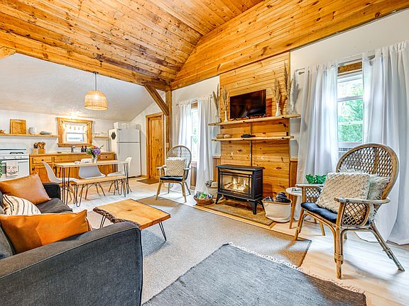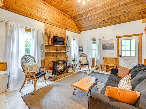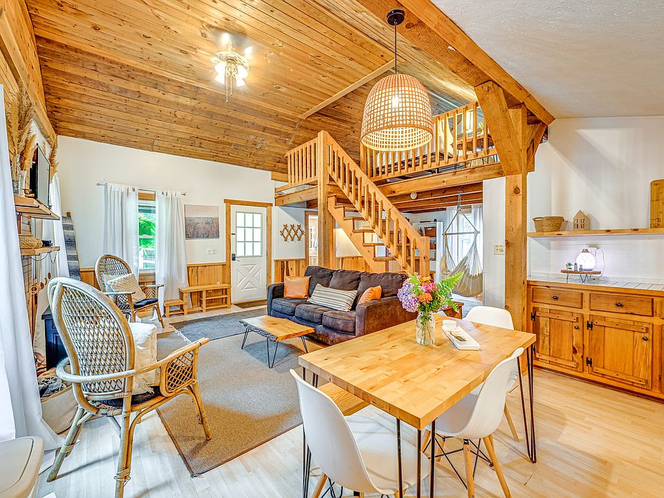 This 2-story cabin requires 3 steps to enter, with a bedroom and bathroom on the 1st floor