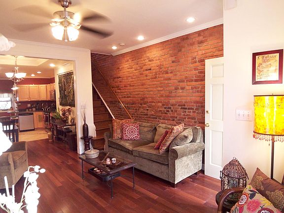 Beautifully renovated 2 BR / 2.5 BA Townhome on a quiet one-way street only steps away from Patterson Park. Freshly painted, open floor plan w/traditional details, molding, tray ceilings, & exposed brick. Modern kitchen w/granite, stainless steel appliances, gas range, dishwasher, microwave & accent-cabinet lighting. Powder room on 1st floor off kitchen. Hardwood floor throughout. Deck directly off bedroom/den. 2 bathrooms with jetted jacuzzi tubs w/skylights above, & modern tile. Laundry closet conveniently located on 2nd level w/modern high efficiency front-loading washer & dryer. Newly renovated finished basement w/2 large rooms for a family room, bedroom, den, and/or large storage room with built in shelving and hanger rods. Rear deck off kitchen steps down to new concrete patio perfect for hosting BBQs. Central A/C & 3 ceiling fans, comfy gas heat & gas fireplace anchoring living room truly heats whole house.