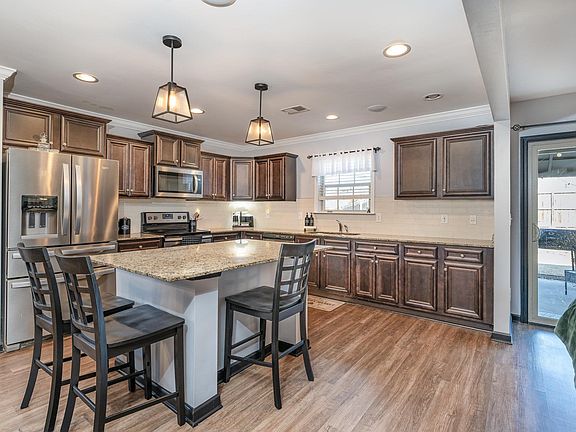 Step into your dream home with this breathtaking and expansive 2-story residence! Featuring 5 bedrooms and 3 full bathrooms, this property provides the perfect environment for your family to flourish in both comfort and elegance. Upon entering, you'll be captivated by the inviting ambiance, highlighted by stunning luxury vinyl flooring and large windows that flood the space with natural light. The main level boasts a spacious living area, ideal for hosting gatherings or enjoying cozy evenings by the gas fireplace. Sliding glass doors from the living room open to a covered patio equipped with a ceiling fan, making it an excellent spot for afternoon relaxation and entertaining. Additionally, the main floor includes a versatile fifth bedroom or office and a third full bathroom! The kitchen is a culinary enthusiast's paradise, featuring stainless steel appliances (including a standalone range), abundant counter space, custom cabinetry, and a striking backsplash. The large island is designed for convenience, complete with outlets for easy appliance use and built-in Bluetooth speakers. Elegant upgraded light fixtures enhance the dining area, while pendant lighting above the island adds a touch of sophistication. There is also a gas hookup available for the standalone range, currently equipped with an electric range. On the upper level, you'll find a magnificent primary suite that includes a luxurious en-suite bathroom with a linen closet, a spacious walk-in closet, and an additional closet for extra storage. Three more bedrooms giving ample space for family, guests, or even a home office setup! The 2-car garage provides generous storage options, making this home the perfect blend of style and functionality.