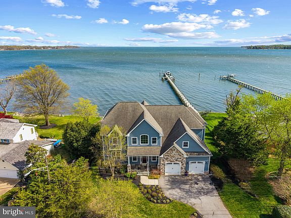 Coastal-style waterfront home with beach, pier and breathtaking open water views of the South River stretching all the way out to the Chesapeake Bay. Designed with an open floor plan and an abundance of natural light, this home features soaring ceilings in the living room and a dramatic floor-to-ceiling stone fireplace that anchors the space. The family room, with its elegant coffered ceiling, and the adjacent dining room both offer sweeping water views, creating the perfect setting for everyday living and entertaining. The gourmet kitchen is a chef’s dream, complete with a large center island with seating, top-of-the-line appliances, and an oversized walk-in pantry. A spacious laundry/mudroom with utility sink adds convenience and function. Also on the main level is a well-appointed guest suite with a private ensuite bath—ideal for visitors, extended family, or multigenerational living. Thoughtfully located away from the main living areas, it offers both comfort and privacy for overnight guests. Whether hosting weekend visitors or accommodating one level living, this main-level suite provides a convenient and flexible living option. Upstairs, the luxurious primary suite is a private retreat featuring vaulted ceilings, a cozy fireplace, a private waterfront balcony, and a spa-inspired bath. Three more bedrooms and two full baths including an additional ensuite bedroom provides plenty of space for family and friends. The waterside of the home is designed for ultimate outdoor living with a covered deck equipped with a TV, dining area, firepit, and an in-ground hot tub located just outside the guest suite. The ideal spots to end or begin a fabulous day of waterfront living everyday! The newly built pier with multiple slips and boat lift extends out into the South River providing easy access for a quick cruise around the river or head out for days on the Chesapeake Bay. A two-car garage with additional storage space completes this exceptional property. Coveted Hillsmere Estates community offers a plethora of amenities including a community pool, beach with pavilion, playground and picnic area. Enjoy close proximity to public/private schools, restaurants/shopping and Quiet Waters Park with over 300 acres of beautiful parkland featuring trails winding through forests and grasslands, summer concerts and winter ice skating; year-round activities are always readily available. Conveniently located to access Downtown Annapolis, head over the Bay Bridge to the Eastern shore or jump on Rt. 50 to get back to Washington, D.C. Welcome Home!