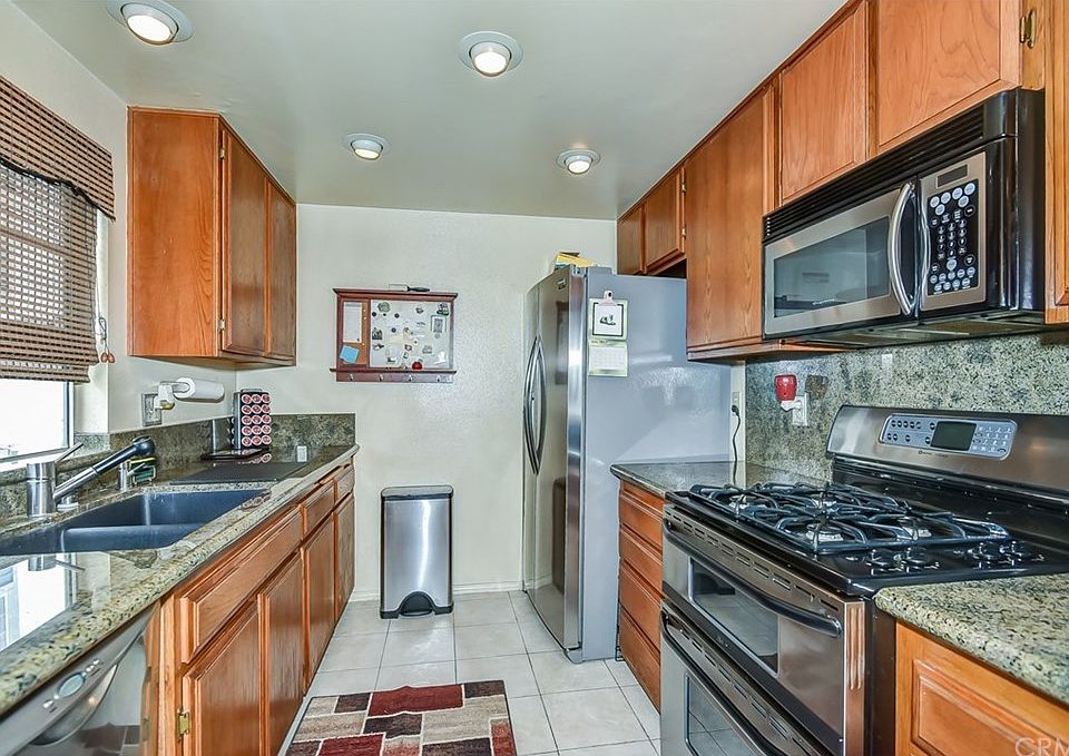 This lovely condo features designer colors and is move-in ready! This condo is truly a rare find! This unit is well located deep within the gated complex in a quiet, private location, just steps from the pool and spa. The kitchen has rich cabinetry, expansive granite counter tops and high-quality stainless steel appliances. The cook in the house will be delighted with the ample storage and food preparation areas...as well as the modern, two-drawer dishwasher and double gas range! The rooms are generously sized and have lots of closet space. The cathedral ceilings upstairs make the large bedrooms seem even bigger than they are. Gorgeous laminate floors run throughout the entire unit. The wood staircase is beautifully finished. The garage is an over-size 2-car, attached, finished space. There is plenty of storage area down there in addition to being able to park two cars. Added bonus, you are freeway-close and minutes from LA or Orange County.