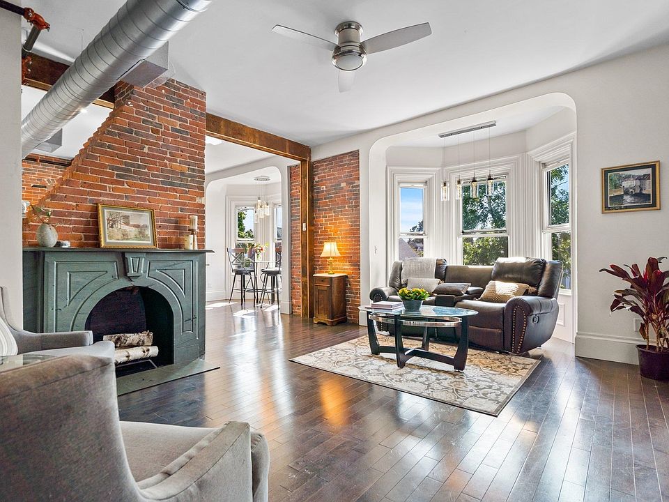 Exceptional jewels like this are so rarely found you won't believe your good fortune. Situated on the 2nd and 3rd floors of the building and recently renovated, preserved original details with thoughtful modern additions and finishes create the perfect blend of novelty and charm. This sophisticated property is located neighboring the Currier Museum and only 5 blocks to downtown. On the main floor, sunlight streams through the south-facing bow, bump-out windows, drawing your attention to the impressive original exposed brick and woodwork, as well as the stately, decorative soapstone fireplace. This room, open to the dining area and kitchen, with its large eat-at island, allows for easy entertaining. Contemporary cabinetry with abundant storage, quartz countertops, stainless appliances, and glass shelving make this kitchen the one of your dreams. An ample mudroom leading to the back stairs and a half bath with laundry are also found here. Upstairs, both generous-sized bedrooms feel airy with cathedral ceilings and exposed multi-directional brick. The primary bedroom has bright, south-facing windows and a small balcony that allow for delightful views of the city. A massive walk-in closet provides excellent storage, and the 2nd bedroom has a substantial closet as well. The bath has a roomy custom tiled shower and double vanity. This unit even has exclusive and common outdoor space to enjoy! LOW CONDO FEES. Agent is Condo Board Pres.