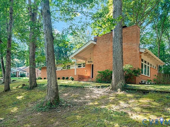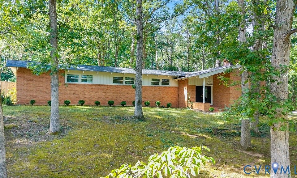 Tucked in Manakin Wood, this custom-built mid-century modern home offers the perfect blend of privacy, style, and natural light. Designed to integrate seamlessly with its wooded setting, the home feels like a private retreat with acres of wooded land behind it as a buffer to the next neighborhood. Inside, soaring beamed and vaulted ceilings, a brick fireplace wall, and expansive windows bring the outdoors in and fill the great room with light. The remodeled kitchen (2022) features white cabinetry, quartz counters, a marble tile backsplash, stainless appliances, and a sleek flat-surface range—modern and streamlined. Hardwood floors extend through most of the main level. Bedrooms include ceiling fans, and the updated hall bath offers tile floors and surround with a new vanity. The primary has a private bath and tiled shower. Step outside to enjoy the peace and quiet of early summer evenings, wildlife views, and spectacular winter sunsets from the deck. The backyard is ideal for pets, play, and gatherings beneath the trees—two of which cradle a hammock perfect for an afternoon rest. The landscaping include Crepe Myrtles and Hydrangeas for Spring and Summer Blooms. Manakin Woods is known for its scenic walks, lake trails, and quiet roads. The optional neighborhood recreation association offers a fishing pond and tennis courts for just $75/year. Only 7 minutes to Capital One and West Creek, and close to Hardywood, Richmond Country Club, Hermitage Country Club, and Kinloch Golf Club. Recent Updates: New roof (2025), Refinished hardwood floors (2025), Kitchen remodel (2022). A home that celebrates light, nature, and connection.