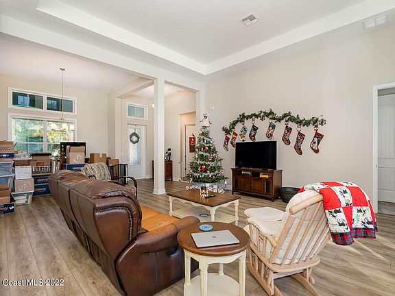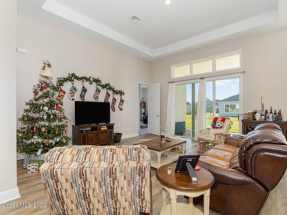 Celebrate luxurious living, close to the river! This beauty is located in the gated Georgiana Reserve Subdivision, steps from the Indian River & full of high-end features! Punctuated w/luxury vinyl floors & crowned w/tray ceilings, this modern abode is wide-open & infused w/natural light. Entertain in a generous great rm w/formal & casual dining areas. At the center, a marbled quartz island kitchen with SS appliances, a wall oven, crisp white cabinetry & walk-in pantry. The master has dual granite sinks, a large subway tiled shower w/bench seating & a big walk-in closet w/personal entry to the laundry rm. 1 of the extra bdrms provides an attached bath. A breezy covered lanai overlooks the sizable backyard. Attention boat lovers! Across the street is the path to the community's riverside dock. You can also relax as you gaze out at the glistening neighborhood lake & enjoy staying active on the nature trail!
