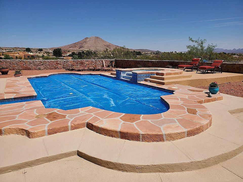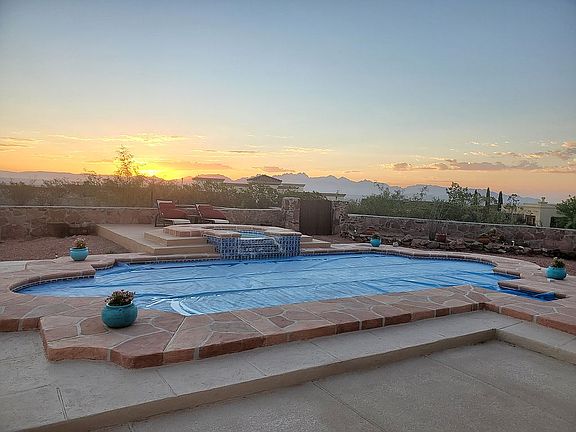 4 Bedrooms, 3.5 bathrooms, 3053 square feet of living space, and a large 3 car garage. Set in the Picacho Hills community, this home includes a gorgeous in ground pool and Jacuzzi that has beautiful views of sunrises and sunsets. Greeting visitors as they enter and exit the home is a gated courtyard in the front and a beautiful covered patio in the back. The interior of the home includes an open floor plan with big and bright family room with an elevated ceiling, decorative wood vigas, clerestory windows, and a built-in kiva fireplace. The kitchen features granite countertops, new black stainless steel appliances, a breakfast bar, and pantry. The master suite includes a large bedroom, a walk-in closet with built-in shelves, and a stylish bathroom with a dual sink vanity, a jetted bathtub, and a glass stall shower with built-in bench. The features a second master bedroom with a private bathroom. The front and back yards are beautifully landscaped and feature flowers, a vegetable garden, palm trees and scattered bushes. The home is Alexa enabled. This home sits atop a hill, giving a Birdseye view of the entire valley!
