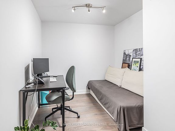 A sunny, south-facing suite in the heart of Leslieville! This well-cared-for one bedroom plus den sits atop The Carlaw with stunning views, stretching all the way to the Lakeshore. White Oak hardwood flooring, quartz countertops, exposed concrete ceilings and a modern kitchen amplify the hip lifestyle that is Dundas & Carlaw. The spacious den is perfect for a WFH setup or can double as overnight guest quarters. Bonus square footage can be found in the laundry closet, large enough to act as an ensuite storage room. Enjoy the full-array of condominium amenities and also immediate access to TTC Transit, Lakeshore Boulevard and the DVP! Underground parking and locker are included to round out this exceptional offer.
