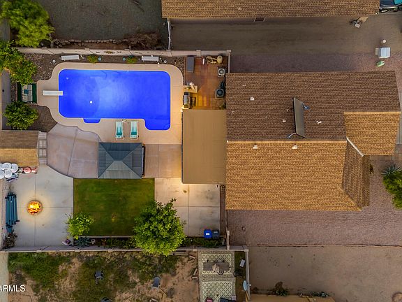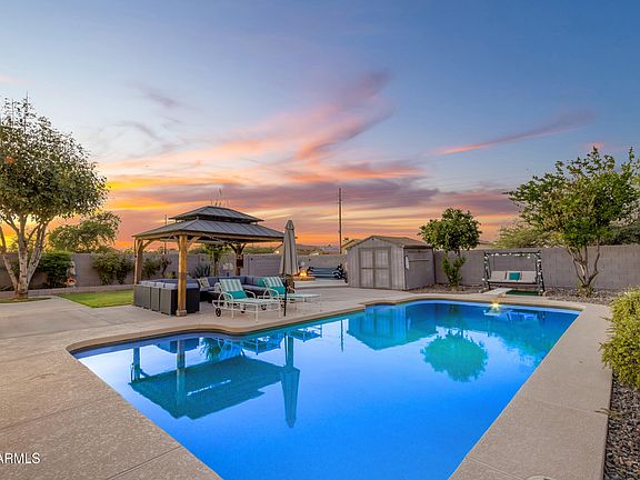 Step outside to your private backyard oasis—perfect for entertaining or relaxing! Enjoy a sparkling pool, a spacious covered patio with automatic sun shades, and plenty of lush green grass surrounded by mature fruit trees. There is also an RV gate to park all your toys or pull your vehicle to the concrete for an auto detail. The built-in BBQ and expansive concrete area make this the ideal space for gatherings year-round. This home perfectly blends comfort, style, and outdoor living in one of San Tan Valley's most sought-after communities.