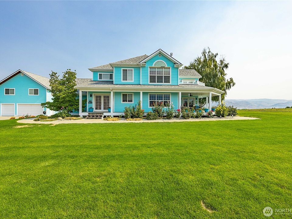 Country Living at Lake Chelan! This statement two-story residence exudes charm with country style living. Views of Lake Chelan from all patios/balconies and stunning territorial orchard and mountain views. Elevated design living with durable fiber cement siding. Enjoy abundant natural light through large windows and relax on 945 sq ft of Patios, balconies and decks, perfect for light breezes and stunning views. Inside, find an open-concept layout, 3 beds, 2.5 baths, and an attached 2-car garage 341 sqft. High ceilings, sturdy bamboo floors and a soothing palette complete this dream home. The 900 sqft storage (future ADU with additional septic and permitting). Massive 900 sqft garage. Live the dream at Lake Chelan in your new sanctuary!