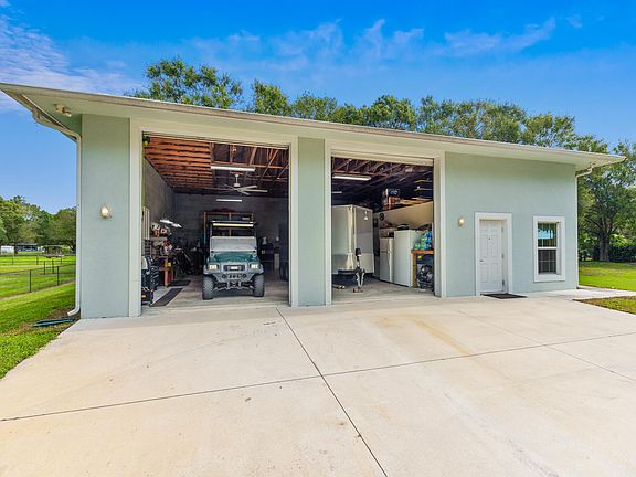 Custom designed pool home & building w/guest house! Built in 2018 for his personal use, award winning builder Harry Blue created a peaceful enclave to call home! On this property of 2.67 acres, you'll find this modern home with cozy wraparound porch nestled amongst mature live oak trees creating a tranquil sanctuary. The main house has 4 bedrooms, a media room, 2.5 baths & a 2 car garage! The 2-bay building out back w/12-foot doors includes living quarters/office space, 1 bedroom, a sitting area, kitchen, additional bath, & laundry area. This separate building accommodates 2 plus cars or bring all the toys, including the boat, RV, oversized trucks, trailers, ATV's & more because it is 42 x36 with plenty of storage space & built-in work benches! 13,000 KW generator for this building! Designer features in the main house include porcelain tile, beautiful listello and inlay work, upgraded lighting, and a custom fireplace that changes color with a stunning brick accent wall in your main living area! Chefs delight in your gourmet kitchen with plenty of room to entertain as the dining room is adjacent, making this a grand gathering place! Yes, there are 3 ovens, sparkling quartz countertops, stainless steel appliances, soft close drawers, under cabinet lighting, & a walk- in pantry that is sure to impress! Perfect home if you have a business, as the office/2nd bedroom in the main house has an exterior door to the front circular drive for visitors. The oversized owners' suite has a sitting area, large walk-in closet, & a gorgeous primary bath with dual sinks and walk in shower! Enjoy movie night in your spacious media room! Step out onto your covered screened lanai, accented with a tongue & groove ceiling, & splish-splash in your 6 ft deep lighted pool! Bring the horses, build a barn, unrestricted, NO HOA, electric gated entry, fenced property. 3 sheds, chicken coop, greenhouse & more! Impact glass! R20 Insulation spray foam w/fire retardant whole house! Alarm System, security cameras, ring doorbell! City water along with a 4" well for complete irrigation system! Close to 95 & TPKE for commuters' delight! Great Property for a Business Owner, zoned AG-2.5! This is an upcoming area about to burst with new developments, shopping, new schools, and more!