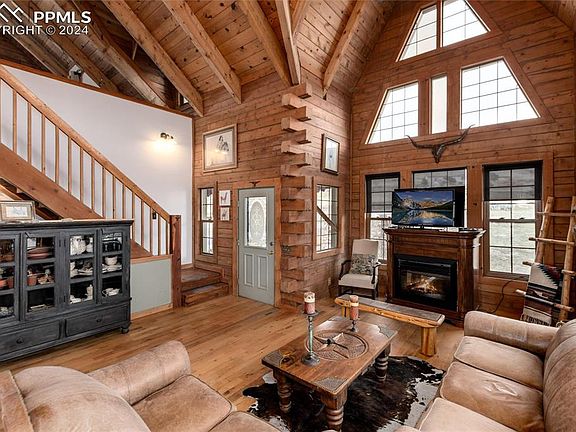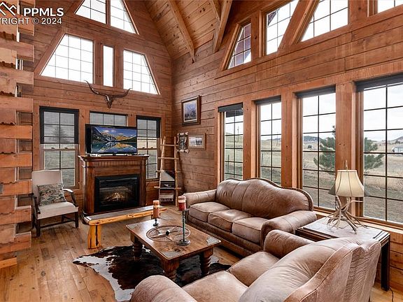 You won't want to miss this log home with views of Pikes Peak and the Larkspur Buttes.  From the moment you arrive on the circular asphalt driveway you have to pause and listen to the silence and be captivated by the stunning views.  Pines and an extensive garden on drip irrigation contribute beauty and wildlife to enjoy.  The main home is 3 bedrooms and 3 baths. There is a bedroom and bath on the main floor and in the upper loft area is the primary suite with sitting room and all new primary bathroom. The basement is finished with a kitchen, one bedroom, 3/4 bath and living room.  The home has a detached oversize garage ( 1080 SF) which contains a remodeled studio apartment with 3/4 bath.    This home exudes charm and warmth with newer (2 yrs) wrap around redwood deck, all new primary bath, laminate flooring, newer washer/dryer, and new Frigidaire stainless kitchen appliances.  Freshly painted throughout. All new dual pane windows and metal roof in 2019.  Bring your horses or critters as there are a couple of fenced pastures and a steel barn with electrcity and water.  A level area with older fencing exists that was used as an arena too.  You are just mintues to Castle Rock or Monument for shopping, Larkspur for meals and summer concerts and the Douglas County open spaces for riding and hiking are all close by.  Any easy drive to Colorado Springs or Denver employment centers makes the location ideal.  There are 2 septic systems which have been inspected and serviced.  The gardens bloom with lots of bulbs and wild flowers.  Enjoy the quiet and sunsets from the newer redwood deck which wraps around the home and provides views of the nearby 22,000 acre Greenland Ranch and Pike National Forest. All furnishngs are negotiable.
