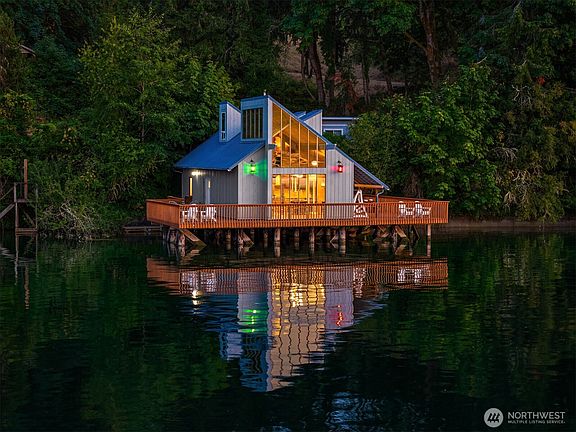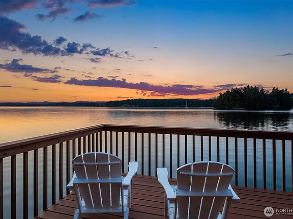 Waterfront living at its finest awaits at this secluded, one-of-a-kind home! At high tide, the house sits entirely over water. Admire views of herons, eagles, seals, and whales, and everything from small boats to large barges. The sunsets over the Olympics are spectacular. A wraparound deck lets you see the sunrise in the East with your breakfast and sunset in the West with dinner. A few stairs to the beach lead you to prime beach combing or a kayak adventure to Eagle Island. The main living space is an open floor plan seamlessly combining the remodeled kitchen, dining area, and living room featuring a cozy pellet stove. The gently sloping 1.3 acres offers many possibilities for a large shop or ADU. Sold fully furnished for a turn-key home!