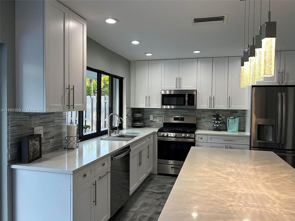 NO HOA POOL HOME! Boasting a spacious open floor plan designed for modern living. Natural light floods the living and kitchen area, creating a warm and inviting atmosphere. Updated kitchen with 42" white wood shaker cabinets with soft close doors, large island, quartz countertops, stainless steel appliances, recessed light, new light fixtures, seamlessly flowing into the dining room space. Freshly painted inside and out, new doors, moldings, baseboards, lighting and Epoxy flooring and so much more. Oversized pool and ample patio space for outdoor lounging and dining. in a desirable neighborhood with easy access to Sawgrass Mall, Sawgrass expressway, dining, and Panthers Stadium. Walking distance to two completely renovated parks! (Splash pad, dog park, basketball and much more.