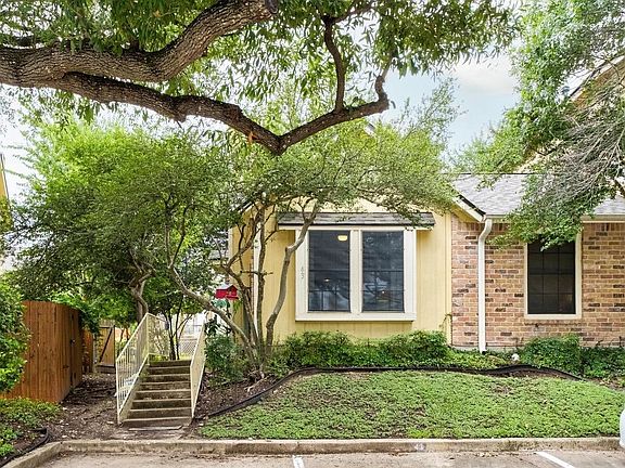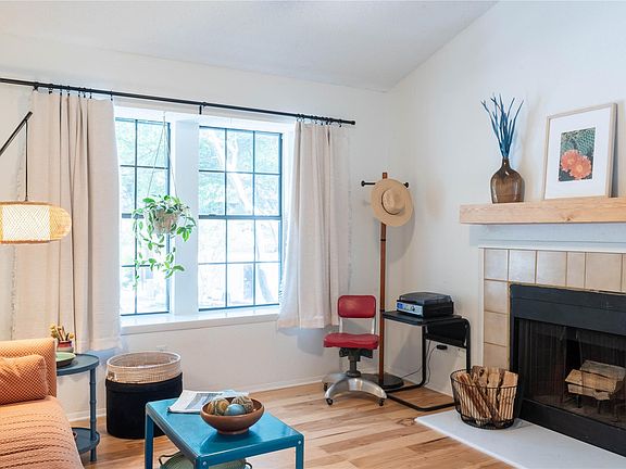 This beautifully updated 1 bed, 1 bath end unit offers resort-style living in a quiet, private setting surrounded by community green space, walking trails, and nature. With no neighbors above, this exclusive one-story home boasts an open layout filled with amazing natural light, soaring ceilings, and thoughtful upgrades throughout. Enjoy recent interior paint, Hickory engineered hardwood floors, updated lighting and ceiling fans, and a striking marble slab fireplace hearth. The bright kitchen features a built-in microwave over the range, and updated fixtures. Relax or entertain in your private fenced patio canopied by trees—a perfect retreat for gardening or lounging. Just steps away, soak under the stars in the community pool and hot tub. With a new roof (2024), recent siding updates, HVAC (2021), tankless water heater, and low HOA fees (under $200/month), this home is as practical as it is beautiful. Centrally located just minutes from The Domain, ACC, Q2 Stadium, and the Cap Metro Rail line. Affordable, low-maintenance, turn-key living in a tranquil, woodsy setting.