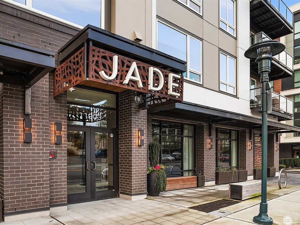 Condo living at JADE RESIDENCE, Totem Lake's premier modern community. This sleek 1-bedroom home features soaring ceilings, oversized windows with great natural light, and a contemporary open layout. The kitchen boasts stainless steel Bosch appliances, quartz counters, and plenty of storage. Full-size washer & dryer included, plus engineered hardwood floors throughout.