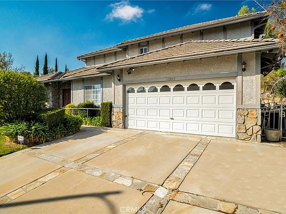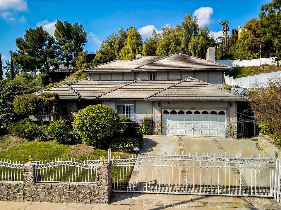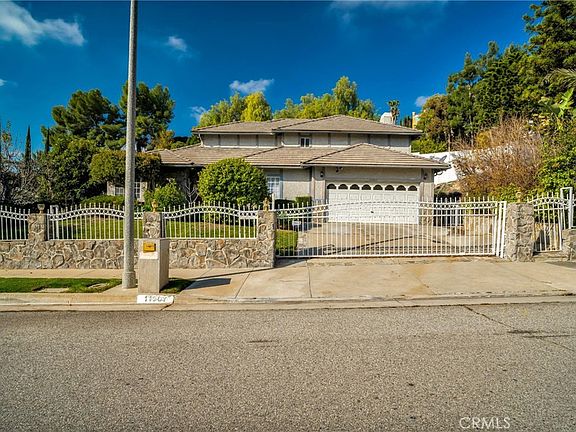 Welcome to this desirable, fully gated two-story residence spanning 2,385 square feet, situated in a tranquil neighborhood north of Rinaldi Street. Located within the boundaries of the award-winning Granada Hills Charter High School, this home boasts excellent curb appeal, enhanced by natural stone accents on the driveway ribbons, facade, and elegant white wrought iron gates. The grand double-door entry opens to a striking two-story tiled foyer. Designed for versatility, the open floor plan offers flexible living spaces, including a sophisticated office or library with French doors and crown molding—easily adaptable as an additional bedroom. The step-down formal living room, featuring mullioned corner windows, flows seamlessly into the formal dining room, highlighted by a curved wall of windows. A convenient butler’s pantry connects to the bright and spacious kitchen, which is appointed with granite countertops, a high tray ceiling, and a sunny breakfast nook with French door access to the back patio. The expansive family room, complete with a natural stone fireplace, wet bar, and French door access to the backyard, provides a warm and inviting space for gatherings. A dedicated laundry room and a ¾ bathroom complete the main level. The luxurious primary suite serves as a private retreat, offering a double-door entry, fireplace, and an en-suite bath with a soaking tub and separate shower. Two additional generously sized bedrooms share a well-appointed full hall bath. Designed for both relaxation and entertaining, the backyard features terraced planting areas, a built-in BBQ, a spa, a decorative fountain, and a spacious stone patio. Conveniently located near premier shopping, dining, and entertainment options, as well as recreational venues like Knollwood Country Club, this exceptional property also offers easy access to major transportation routes. Don’t miss this rare opportunity to own a stunning home in a prime location!