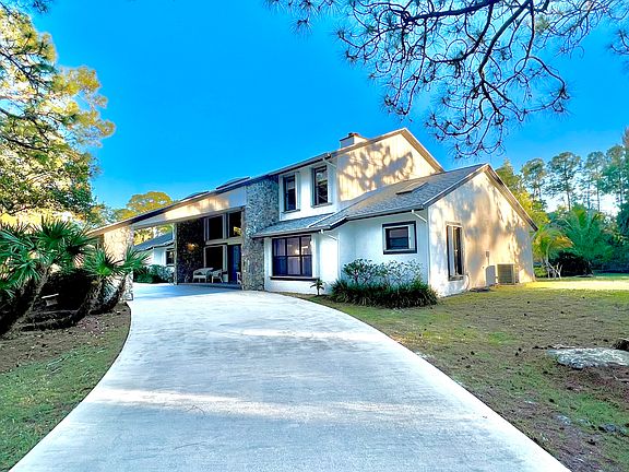 Beautiful two story home on a vast 2.5 acres including natural stone fireplaces, upgraded flooring, balconies, and private patios for outdoor access. Open and airy with gorgeous natural lighting with newly installed solar paneling. Spacious loft for additional living and private suite on main floor. Large swimming pool with expansive outdoor living space and lit metal roof gazebo. 2022 renovated master bath with rimless glass. Lucious landscaping in the well desired area of Jupiter Farms.