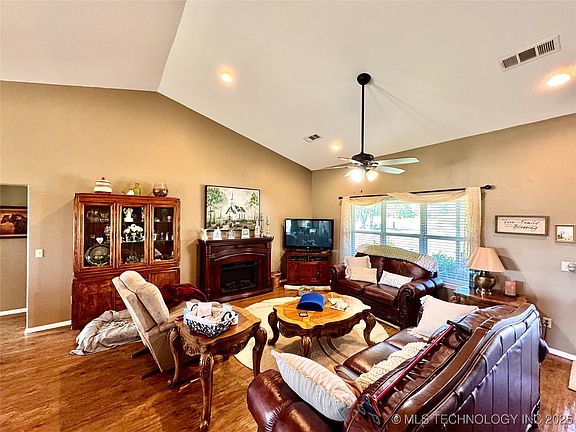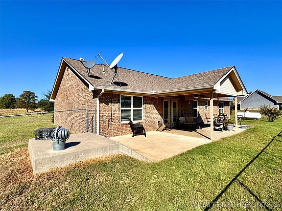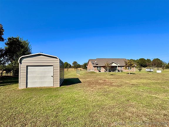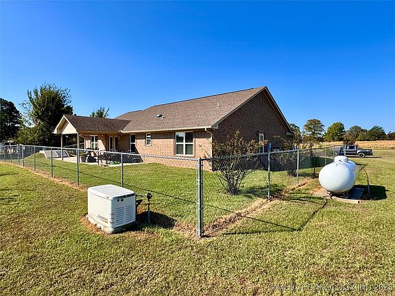 Immaculate furnished 3-bedroom 2-bath brick home on 2.25 acres just east of Hugo. Warm earth tones throughout with an open-concept living area with vaulted ceilings that connects to a spacious kitchen with abundant counter space, bar seating and dining area. The master suite offers vaulted ceilings, dual-sink vanity, bath/shower combo, and walk-in closet. Energy-efficient hot water heater, and a whole-house water filtration system on Grant Rural Water. A Generac generator with a dedicated 500-gallon propane tank that provides backup power. Exterior highlights include a covered patio, chain-link fenced back yard, storm cellar, and 12x24 storage building/shop with concrete floor and roll-up door. Most furniture stays—turnkey and move-in ready!