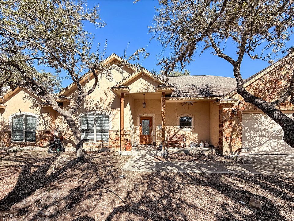 Welcome to this charming single-story home for sale in Rivermont, where comfort, space, and Hill Country living come together beautifully. Step inside to an open floorplan designed for both everyday living and entertaining, anchored by a cozy fireplace that creates a warm and inviting atmosphere. The large kitchen offers abundant storage, ample counter space, and a convenient breakfast bar, making it the heart of the home for gatherings big or small. This home features four spacious bedrooms, including a private primary suite with a walk-in closet, double vanity, walk-in tiled shower, and a separate soaking tub. Situated on a half-acre lot, the property offers a rare blend of privacy and functionality with a private well and water storage tank, chicken coop, and storage shed, perfect for those seeking a more self-sufficient lifestyle. A circular drive framed by beautiful mature oak trees adds curb appeal and easy access. Residents of Rivermont enjoy an impressive array of community amenities, including a pool, waterfront parks, soccer fields, playgrounds, and more, offering something for every age and lifestyle. This property is a wonderful opportunity to enjoy peaceful outdoor living while still being part of an amenity-rich community. Don't miss your chance to call Rivermont home.