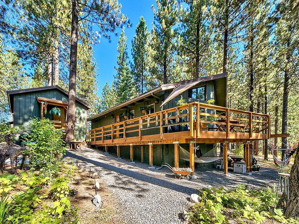 Fully furnished, sanctuary single-level Tahoe cabin with beautiful mountain design, wrap around deck, gorgeous garden, and California Tahoe Conservancy land to one side! Looking over the back of the parcel, enjoy the wide-open kitchen and living room space with access to the deck through the prow-front design for serene moments overlooking the garden below with an array of beautiful landscaping including dogwood, current, aspen trees, alder trees, maple trees, cedar trees as well as lilacs and peonies. Down the hall find two bedrooms (one with a full bath), as well as a third room that could be used as an office or sleeping area. Outside, meander through the carefully crafted garden with multiple spaces to relax and take in the mountain air. The generous storage taking advantage of the sloped parcel is accessed at the back of the house. Don't forget the full single-bay garage for parking or additional storage - located right next to the house. The roof, furnace, windows, and decking have been updated. This quiet location is just steps from fantastic recreational trails to the south, and easy use of Pioneer Trail for getting to Heavenly Resort, restaurants and beaches of South Lake Tahoe, and the excitement of Stateline, Nevada.