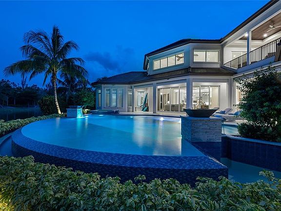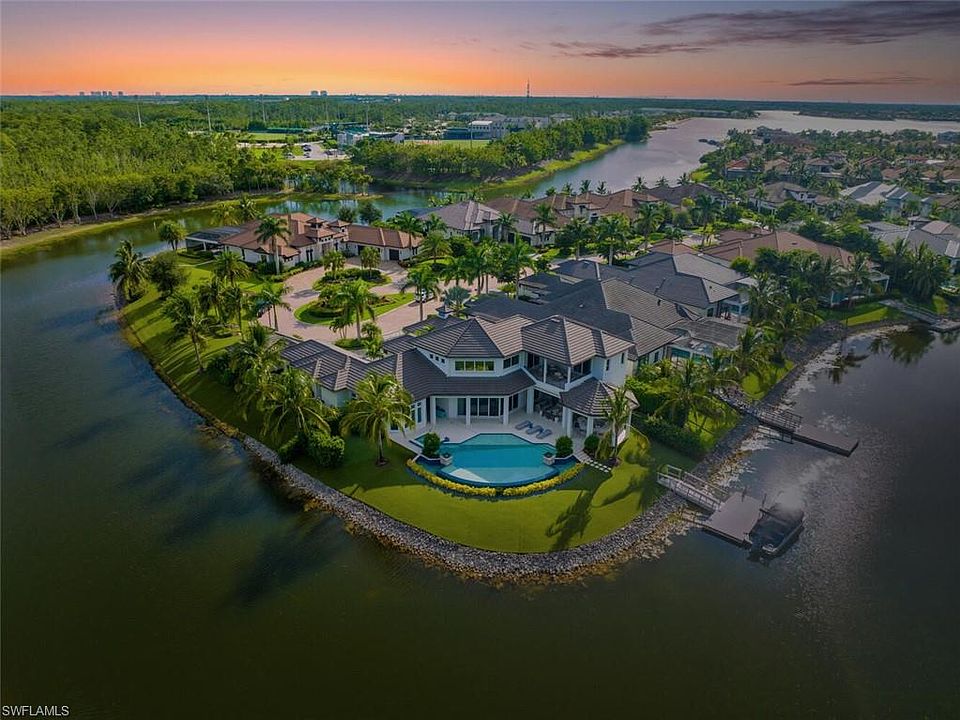 The ultimate waterfront lifestyle awaits in this exclusive Estate property with private dock in Miromar Lakes Beach & Golf Club. Perfectly designed on a private peninsula waterfront homesite, this magnificent 5-bedroom residence showcases exquisite architectural details. The centerpiece is a soaring, open-concept great room with grand chandelier & lighted 24-foot dual-sided linear gas fireplace. Design features include white oak wood flooring, tongue-and-groove and wood beam ceiling details, designer tile, open concept gourmet kitchen, butler’s pantry, and back-up generator. The primary suite offers a gracious bath with dressing area, steam shower, 3 walk in closets including a hers dressing room and separate entry. The second-floor with elevator access includes a game room, en suite bedroom, and open-air balcony. The outdoor oasis offers living room, fireplace, cooling system, electric screens, fully turfed yard with sprinkler system, wrap-around bar with grill and resort-style saltwater infinity edge pool, spa, outdoor shower, private dock. Tesla charger, AC garages, and home gym which can be converted back to additional garage. This is the perfect property for a discerning buyer looking to immediately begin enjoying the Miromar Lakes lifestyle and its unparalleled waterfront living. As the only southwest Florida community with miles of beach, boating, golf, and resort-style amenities in one picturesque destination, it offers a truly remarkable lifestyle. Water-ski, paddle board, kayak, sail, or fish on the 700-acre freshwater lake, unwind at the wellness spa, play the Arthur Hills “Signature” championship golf course, hone your tennis, or pickleball skills, or simply relax in the dreamy beachfront cabanas. Located minutes from Southwest Florida International Airport, world-class beaches, shopping, and dining.