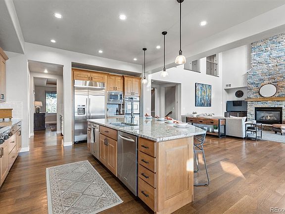 Entertain in style in the walkout basement w/tall ceilings, a beautiful stone bar w/ wine room, generous family/bonus room adorned with yet another fireplace offering mountain views. 2 more expansive bedrooms w/ en-suites provide luxurious accommodation for family & friends. Home theater promises unforgettable cinematic experiences, Bell Cross Ranch offers access to scenic trails & the unparalleled beauty of the Peak-to-Peak Mountain range. Proximity to restaurants, shops, & major highways including C-470 and DIA, this idyllic location seamlessly blends convenience with luxury, offering a lifestyle of unparalleled refinement and sophistication.