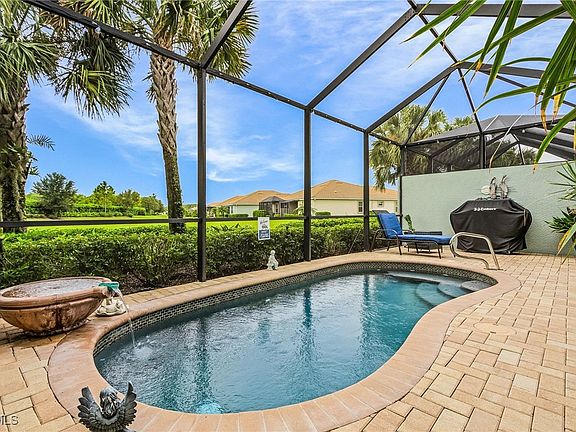 A must see villa with a great backyard setting to enjoy the screened lanai with private pool and additional lighting. There is a screened slider on the lanai that leads to the living room with crown molding and remote Roman Shades. This 3 Bedroom home boasts many upgrades starting with a screened entry with glass insert front door. There are tile floors through the main living area, Luxury Vinyl Plank flooring in the Primary and new carpet (2025) in the guest rooms. The Kitchen has beautiful two tone cabinets with under cabinet lighting, an Island and wine bar with pull out shelves, additional cabinetry in the eating area plus a Keurig coffee maker with a direct line. There are newer LG appliances with transferable coverage (5/2026). Other upgrades: Hurricane Shutters, whole home water purifier and RO (2020), Hot Water Heater (2021), HVAC with UV Light (2024), new pool pump (2024) and all LED lighting. The interior was painted (2024), exterior painted (2025), roof baffles and vents resealed (2024), fresh landscaping (2024) roof cleaned (2025) and tile floors sealed (10/2025) with a 5 year transferable warranty. There is a portable whole home generator (2024) and lanai TV that will convey with the home. This home has it all where you can move right in and start to enjoy your new resort lifestyle. Pelican Preserve is a nationally recognized active adult 55+ community with endless amenities including the Flip Flops outdoor restaurant, 3 pools, Tennis, Pickleball, Bocce, Softball, Fitness, Movie Theater, Billiards, Hobby Rooms, Amphitheater, Destinations indoor restaurant, plus many special events throughout the year. The Brokke Center includes a Library, Card Rooms and Coffee Center for socializing with friends. Pelican Preserve has a 27 hole Private Golf Club with optional memberships. Pelican Preserve is a short drive to RSW Airport and many shops and restaurants and the gulf coast beaches. It's time to call this your next home. Some furniture is available in a separate bill of sale.