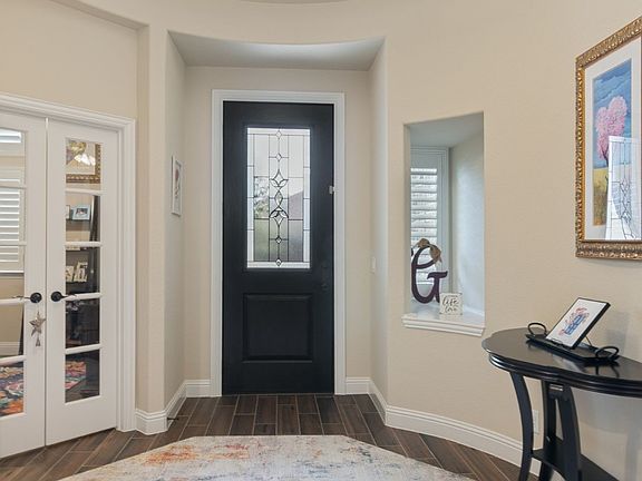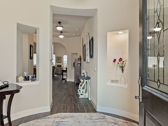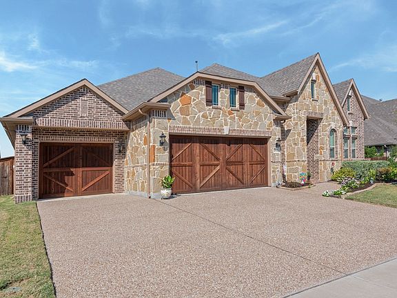 This gorgeous, very spacious one story home features a three car tandem garage, permanent Eufy under eave lighting that changes colors for holidays, football season or for everyday use. Covered back patio for entertaining or relaxing and beautiful landscaping. Once you enter the home you'll be wowed by the amazing foyer with niches and a lovely office. This home also has split bedrooms, a mud bench and a large laundry room with extra cabinet space. Wood look tile throughout most of the home. Lot's of room for large gatherings with a formal dining room, breakfast dining (with a window seat) and amazing kitchen island with bar stool space. The amazing kitchen has a gas cooktop, lot's of cabinets, stainless steel appliances and granite countertops. The stunning floor to ceiling fireplace makes a statement in your living room and will keep you warm you in the winter with the clean burning gas logs. Plantation shutters are an added bonus along with light filtering blinds. Upper living room window blinds are remote. The primary bedroom is a wonderful retreat and the primary bathroom features an oversized walk in shower, separate vanities, linen closet and walk in closet. New front door with warranty, Ring door bell and security system. Conveniently located to schools, shopping and dining. Not far from I35 for those that commute to Fort Worth or Denton for work.