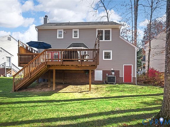 Welcome to this beautifully maintained 3-bedroom, 2.5-bath home in the heart of Midlothian. The paved driveway leads to a wood stoop with a concrete floor & brick façade opening into a welcoming foyer with crown molding, chair rail & coat closet. The family room features hardwood floors (replaced Nov 2023), a wood-burning fireplace with green marble surround & mantle, and double doors leading to a large rear deck. The kitchen offers oversized ceramic tile, granite countertops (Sept 2018), white cabinetry, stainless steel appliances, a decorative sink light, a half bath with granite (Sept 2018) & a convenient laundry closet with stackable washer/dryer (Aug 2020). The dining room has hardwood floors, crown molding, chair rail, and a door for added privacy. Upstairs, the primary suite includes carpeted flooring (May 2018), a walk-in closet with built-in shelving & an ensuite with LVP flooring (Mar 2020), walk-in shower, single vanity & large linen closet. Two additional bedrooms feature carpet, overhead fans & generous closets, with bedroom three providing access to a floored walk-up attic with lighting, outlets & HVAC system (Carrier 3-ton, 16 SEER, Nov 2021). Both upstairs baths have LVP flooring (Feb 2019). Enjoy outdoor living on the back deck (June 2020) with rope lighting & privacy wall, overlooking a wooded backyard with a flat green area for play or outdoor activities. Additional exterior updates include roof and shed (Aug 2018), windows, vinyl siding & gutters with guards (Fall 2018), PVC front porch railings (Apr 2020), all exterior doors including attached shed (Nov 2020), and a lean-to shed (Winter 2025). Appliances include refrigerator (Feb 2022) and microwave (Jan 2023). This home combines comfort, updates, storage, and an ideal Midlothian location.