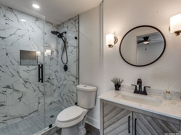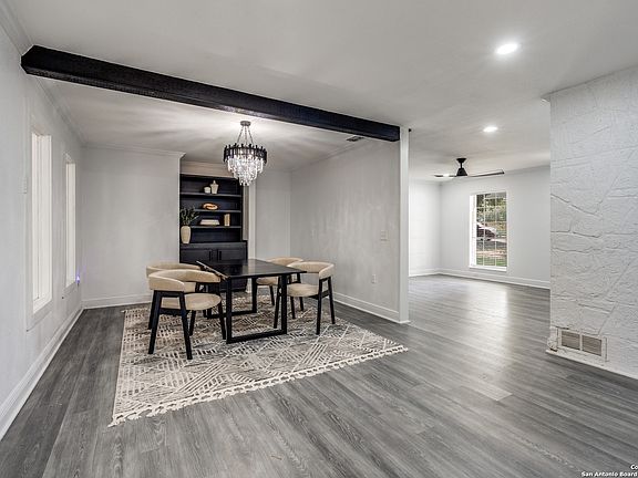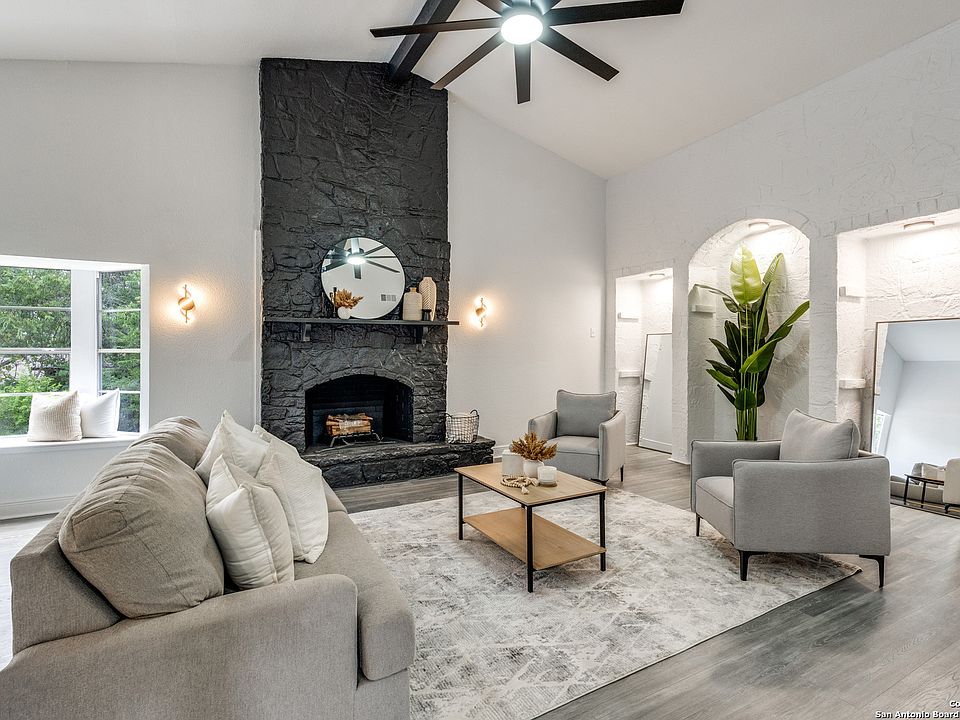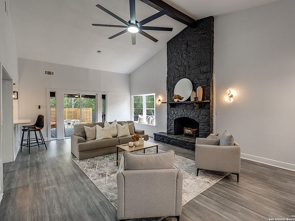 Stylish 4-bedroom, 2-bath home on a 0.25-acre lot in Northeast San Antonio. Features include vaulted ceilings, designer accent walls, and a striking black fireplace in the spacious living area. The kitchen offers quartz countertops, stainless steel appliances, and an open layout. Luxury vinyl plank flooring runs throughout. The large backyard includes a covered deck, custom bench, and stone fire pit-ideal for entertaining or relaxing.